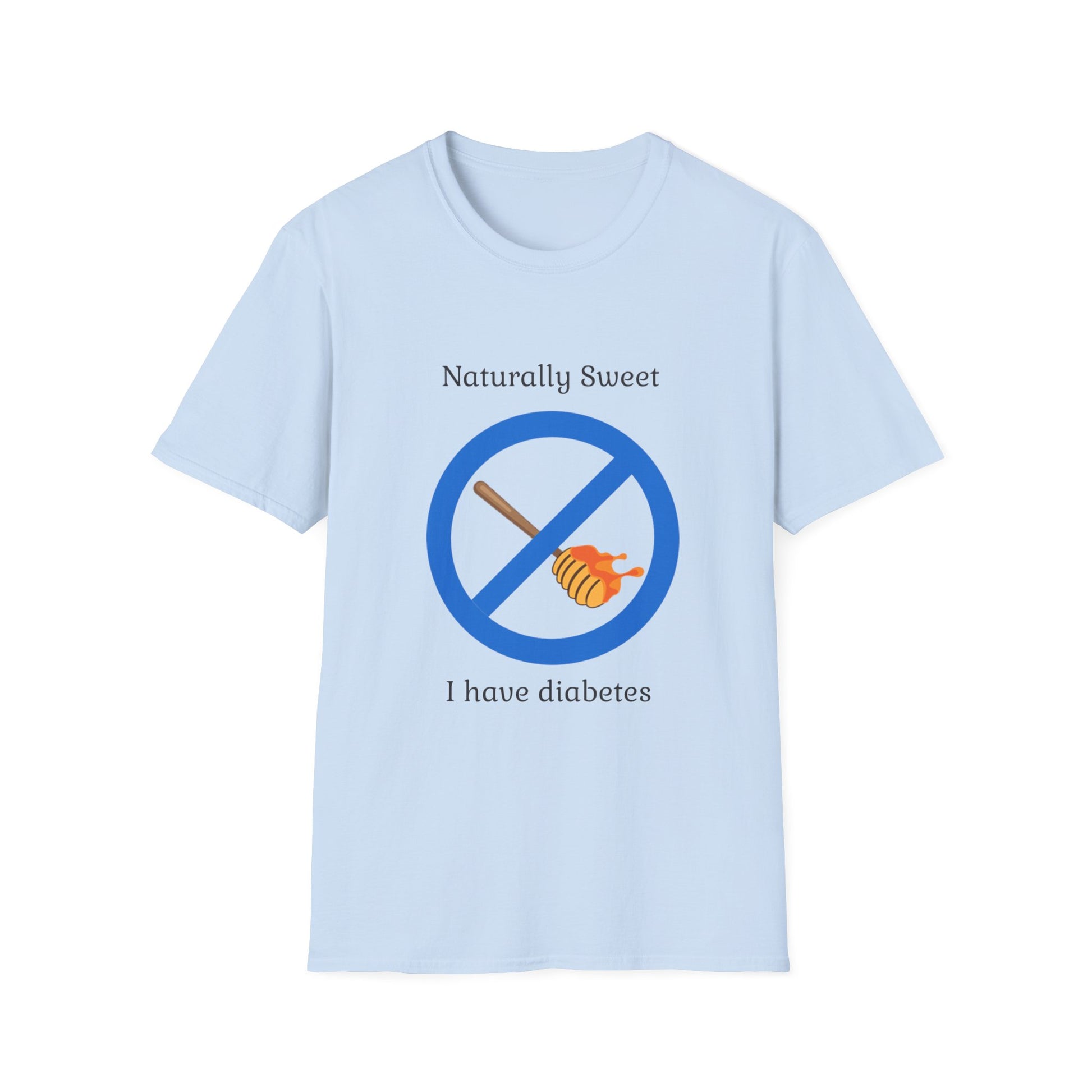 A lightweight, breathable tee that starts conversations with quiet confidence. The front graphic communicates a simple health message with gentle humor: a crossed-out honey dipper under the line “Naturally Sweet” and the statement “I have diabetes.”